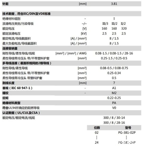 接線端子排型號(hào)常用英文字母、數(shù)字、拼音字母的方式,來(lái)標(biāo)明接線端子排電流量、尺寸和端點(diǎn)數(shù)量,以及廠家系列產(chǎn)品的型號(hào)等,如插拔式接線端子插頭PGF-381圖所示: