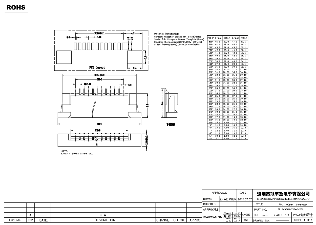 產品簡介品名:FPC連接器規(guī)格:臥式貼片/90°間距:1.0mm/上接觸PIN數(shù):4P-30P高度:2.0mm