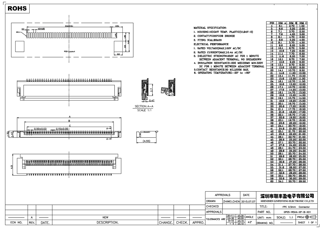 產(chǎn)品簡介品名:FPC連接器規(guī)格:臥式貼片/90°間距:0.5mm/翻蓋式PIN數(shù):4P-60P高度:1.50mm