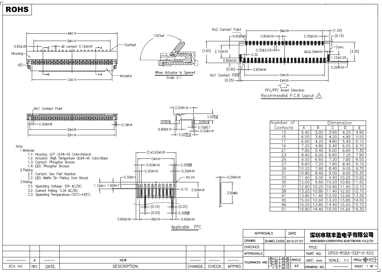 產(chǎn)品簡介品名:FPC連接器規(guī)格:臥式貼片/90°間距:0.3mm/翻蓋式PIN數(shù):13P-51P高度:1.00mm