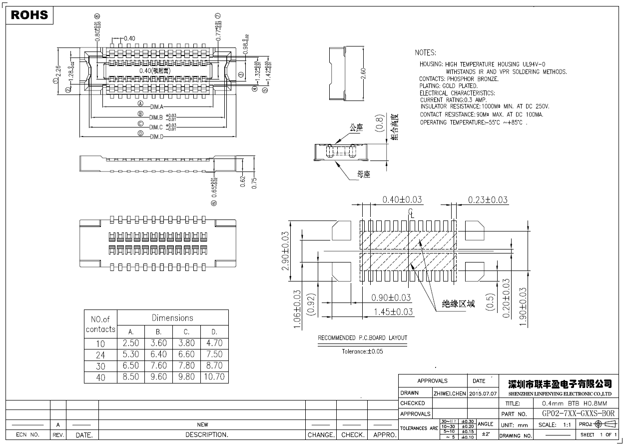 產(chǎn)品簡(jiǎn)介品名:0.4mm單槽板對(duì)板連接器母座H0.8型號(hào):LFY02-7XX-GXXS-BOR規(guī)格:0.4mm間距/立式180°PIN數(shù):10-40PIN塑膠顏色:黑色