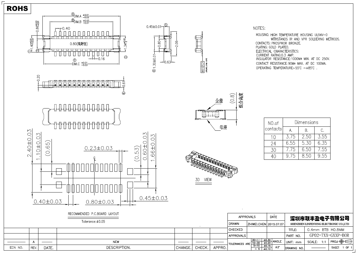 產(chǎn)品簡介品名:0.4mm單槽板對板連接器公座H0.8型號:LFY02-7XX-GXXP-BOR規(guī)格:0.4mm間距/立式180°PIN數(shù):10-40PIN塑膠顏色:黑色