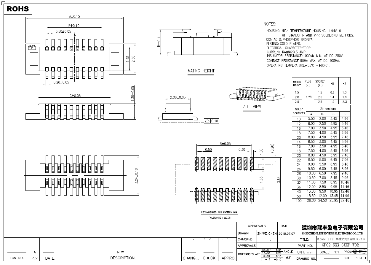 產(chǎn)品簡介品名:0.5mm單槽板對板連接器公座型號:LFY02-5xx-GxxP-WOR規(guī)格:0.5mm間距/立式180°PIN數(shù):10-80PIN塑膠顏色:米黃色