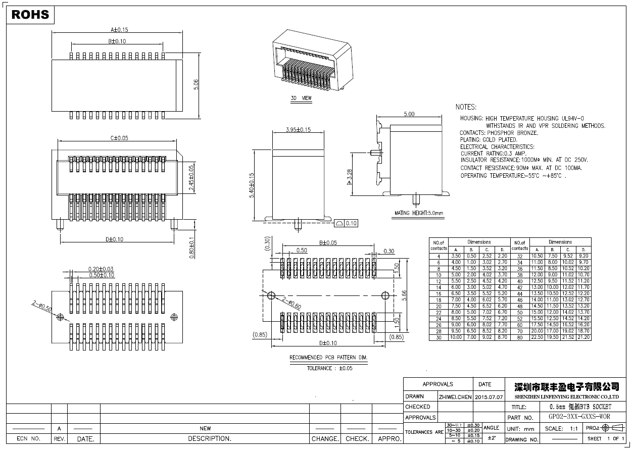 產(chǎn)品簡介品名: 0.5mm側(cè)插板對板連接器母座型號:LFY02-3xx-GxxS-BOR規(guī)格:0.5mm間距/臥式90°PIN數(shù):4-80PIN塑膠顏色:米黃色