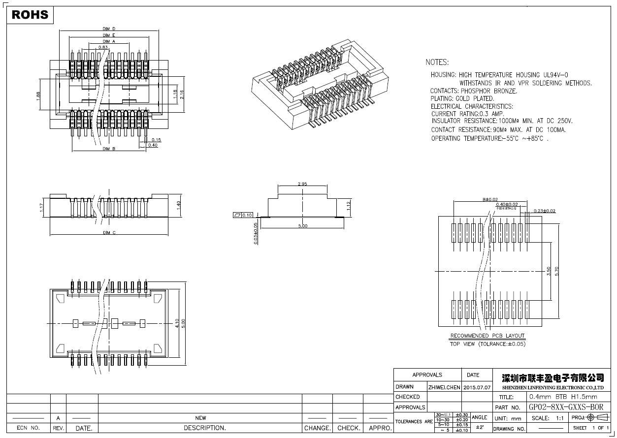 產(chǎn)品簡介品名:0.4mm單槽板對板連接器母座H1.5型號:LFY02-8XX-GXXS-BOR 規(guī)格:0.4mm間距/H1.5mmPIN數(shù):20-60PIN塑膠顏色:黑色