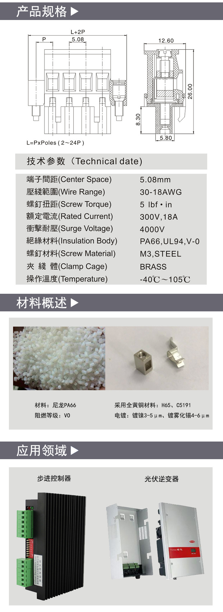 插拔式接線端子5.08間距180度直頭法蘭 300V 15A 02P-24P