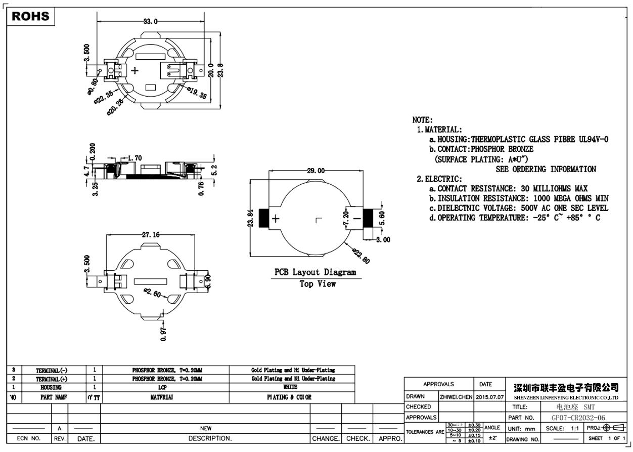產(chǎn)品簡(jiǎn)介品名:電池座產(chǎn)品型號(hào):LFY07-CR2032-06電池型號(hào):CR2032產(chǎn)品規(guī)格:SMT/貼片式備注:本色