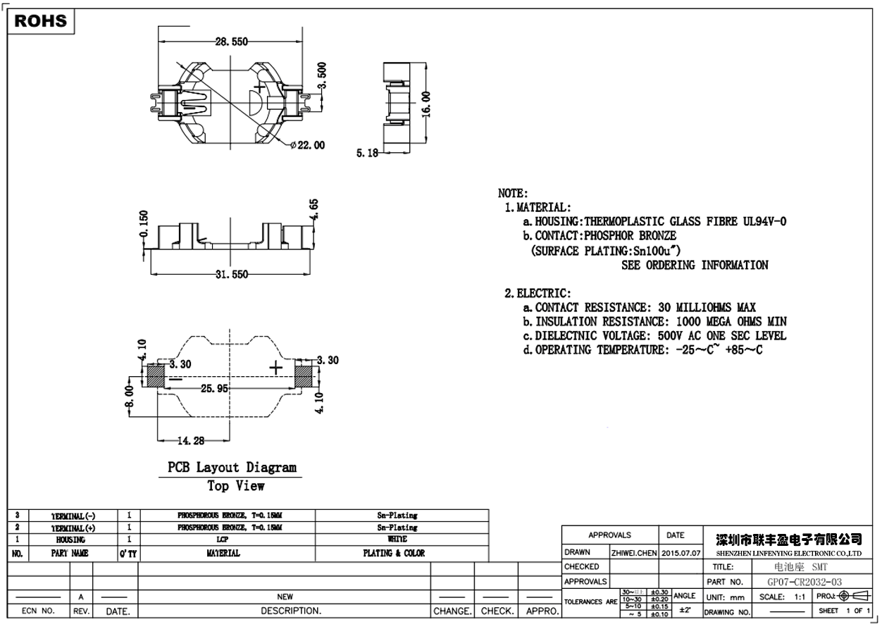 產(chǎn)品簡介品名:電池座產(chǎn)品型號:LFY07-CR2032-03電池型號:CR2032產(chǎn)品規(guī)格:SMT/貼片式備注:本色