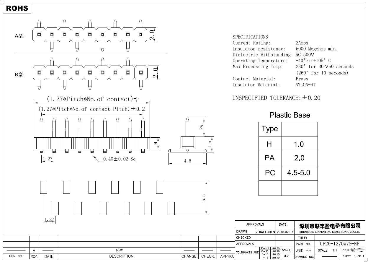 產(chǎn)品簡(jiǎn)介品名:排針規(guī)格:貼片/立式180°間距:1.27mmPIN數(shù):2-40PIN備注:排針系列