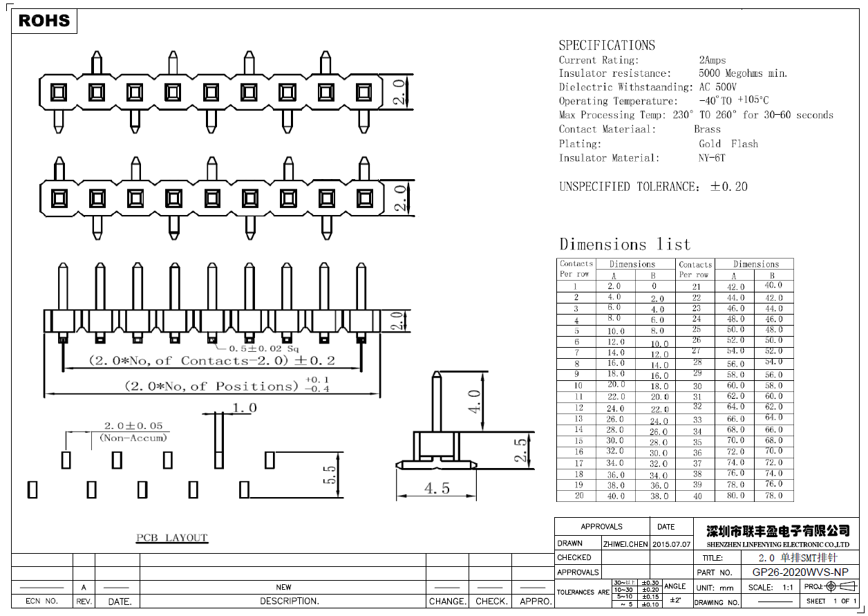產(chǎn)品簡介品名:排針規(guī)格:貼片/立式180°間距:2.00mmPIN數(shù):2-40PIN備注:排針系列