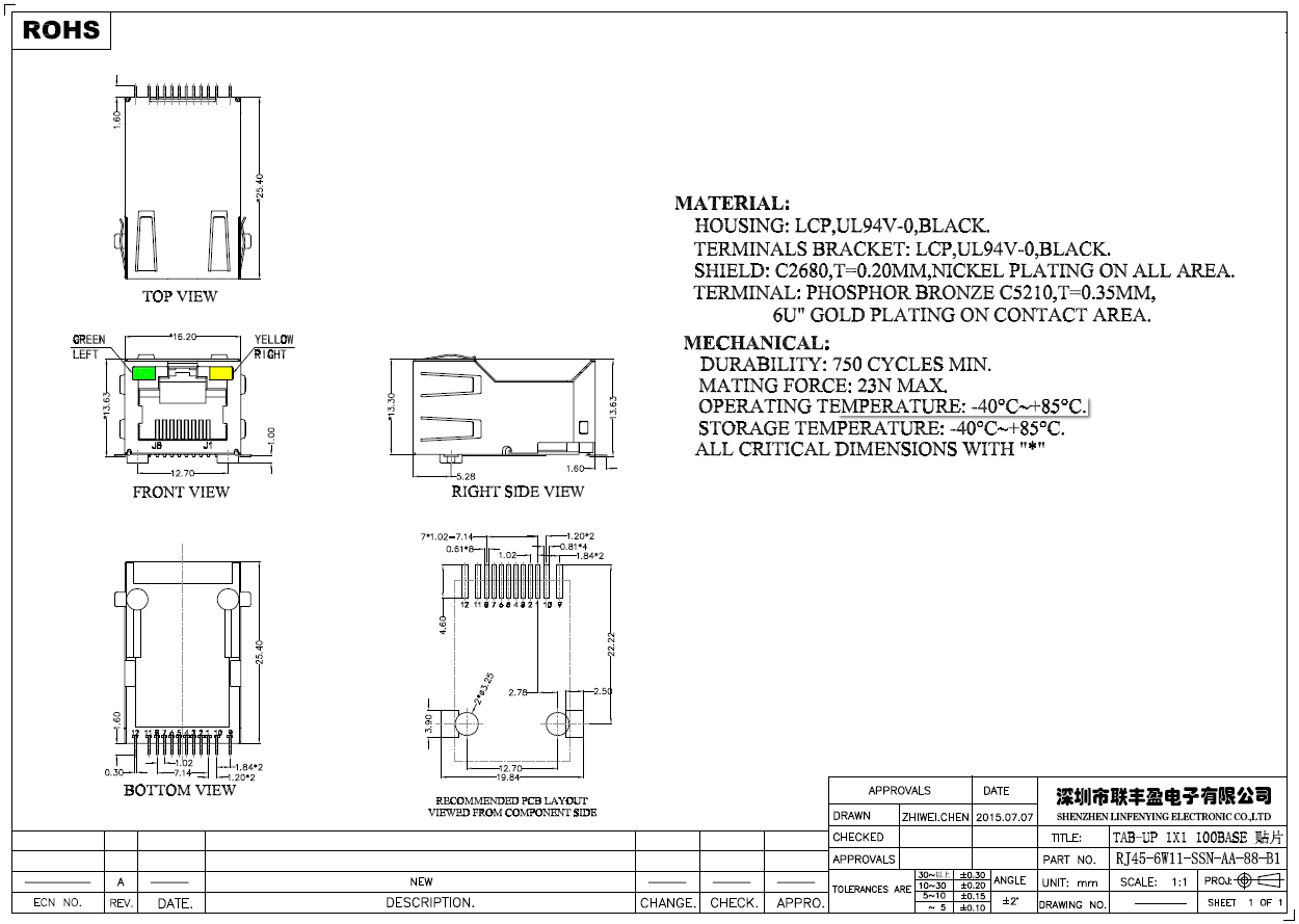 產(chǎn)品簡(jiǎn)介品名:RJ45網(wǎng)絡(luò)連接器規(guī)格:臥式SMT/帶變壓器外殼:帶屏蔽/帶彈片LED燈:黃/綠-其它顏色可定制塑膠顏色:黑色