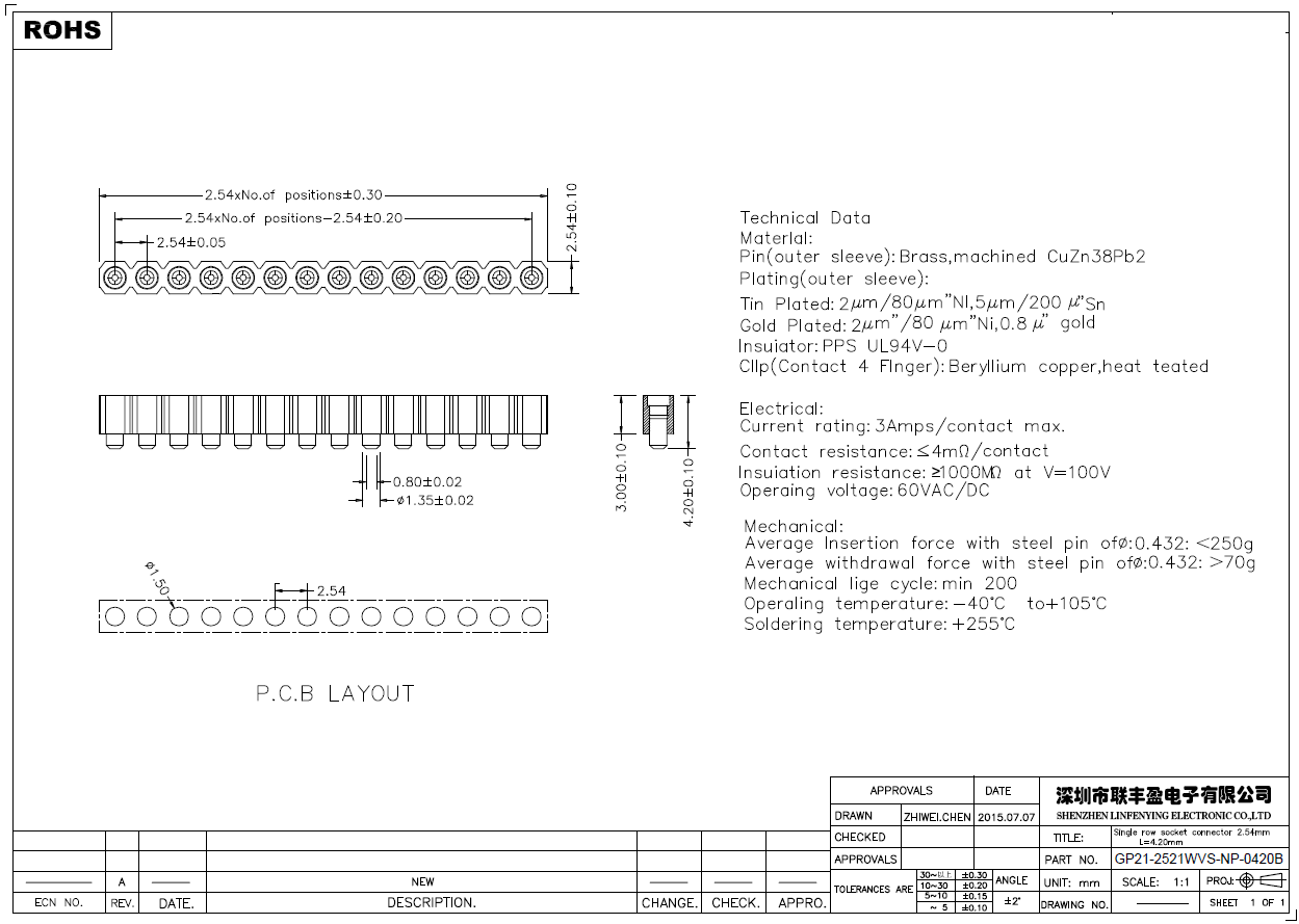 產(chǎn)品簡介品名:排母規(guī)格:貼片/立式180°間距:2.54mmPIN數(shù):2-40PIN備注:圓孔排母系列