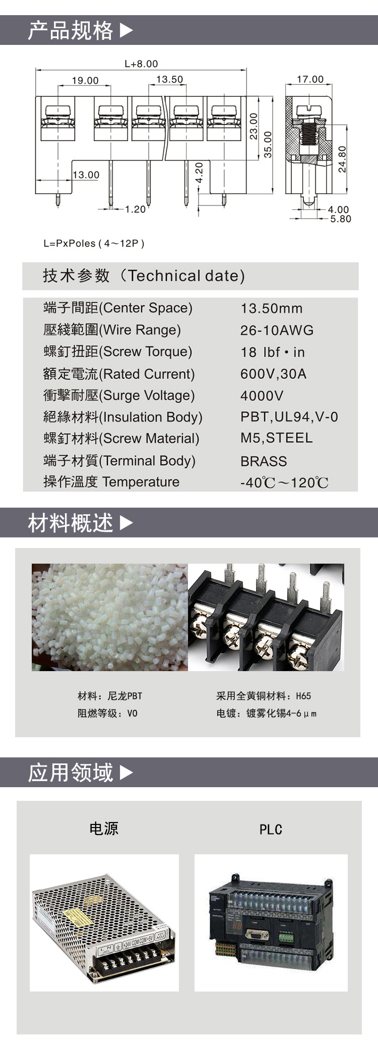 柵欄式PCB接線端子焊腳13.5間距;技術(shù)參數(shù)